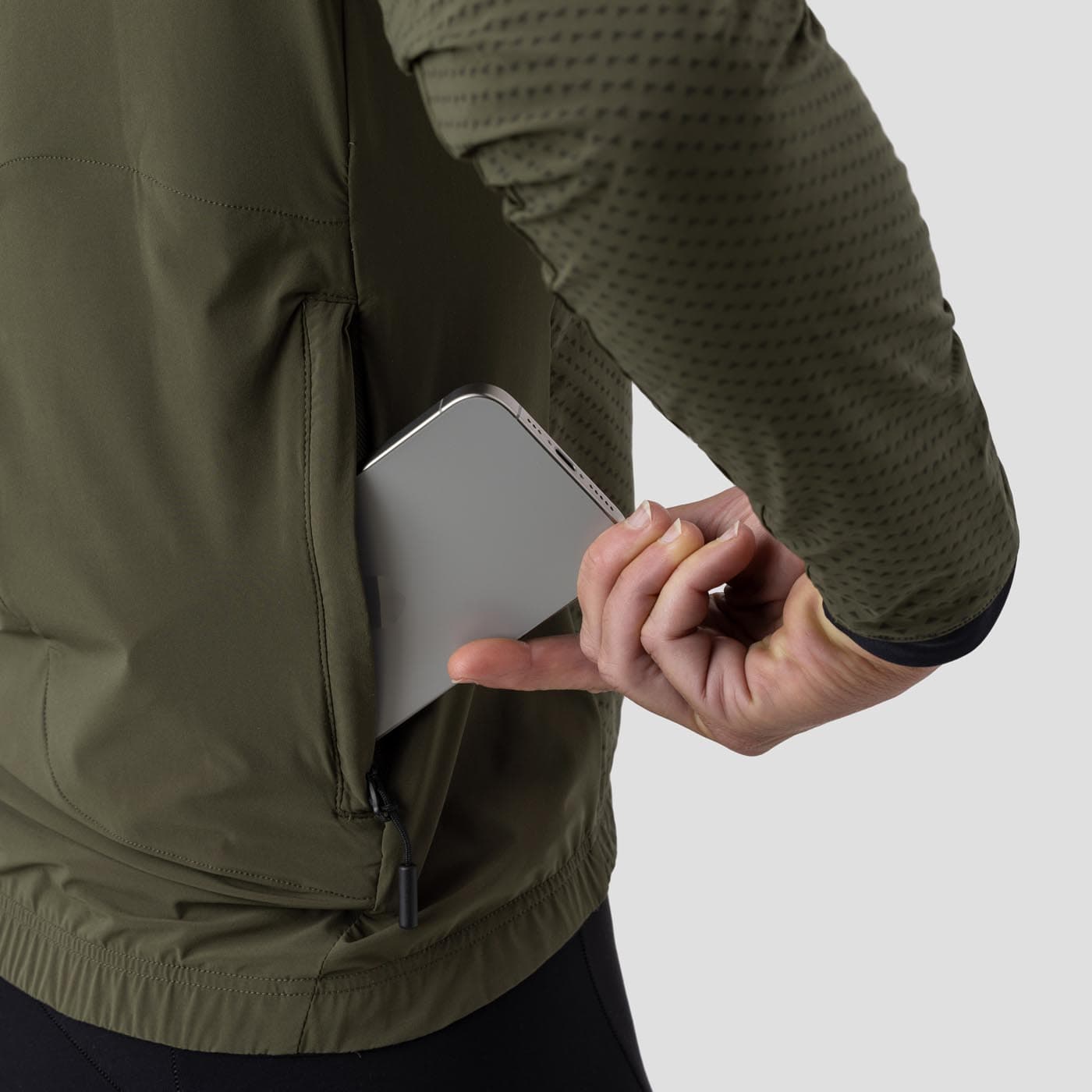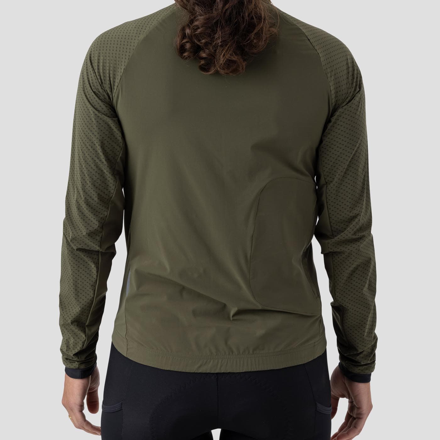 That’s not all, we designed a lofted pattern at key points to insulate, ensuring that you stay warm and dry. Speaking of dry, the fabric has a patented c0 PFAS-free DWR treatment that sheds moisture and dries fast. For its final magic trick - when not being worn, it neatly packs into its rear pocket and for stowage in a jersey pocket or strapped to your bike (see our Macgyver Strap).