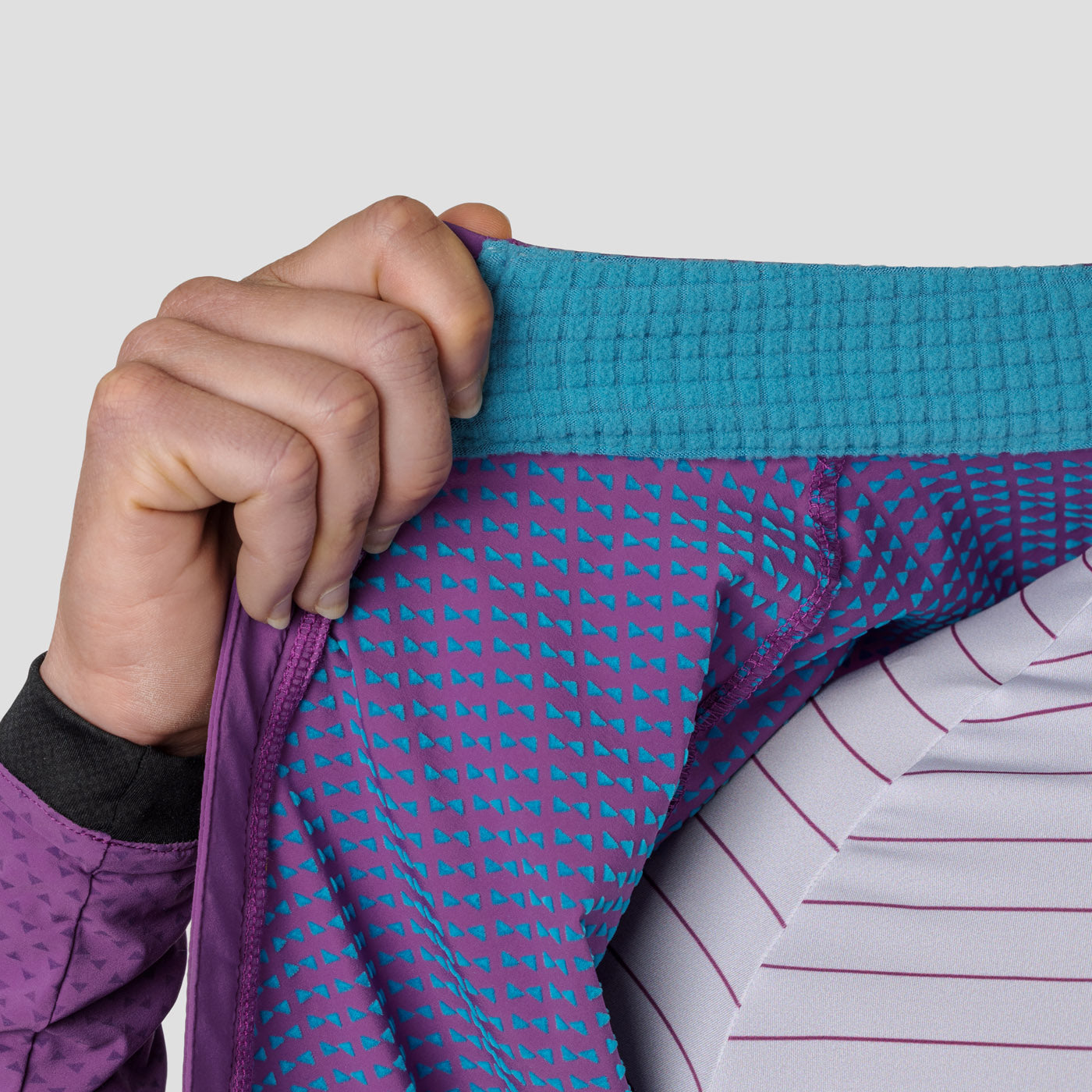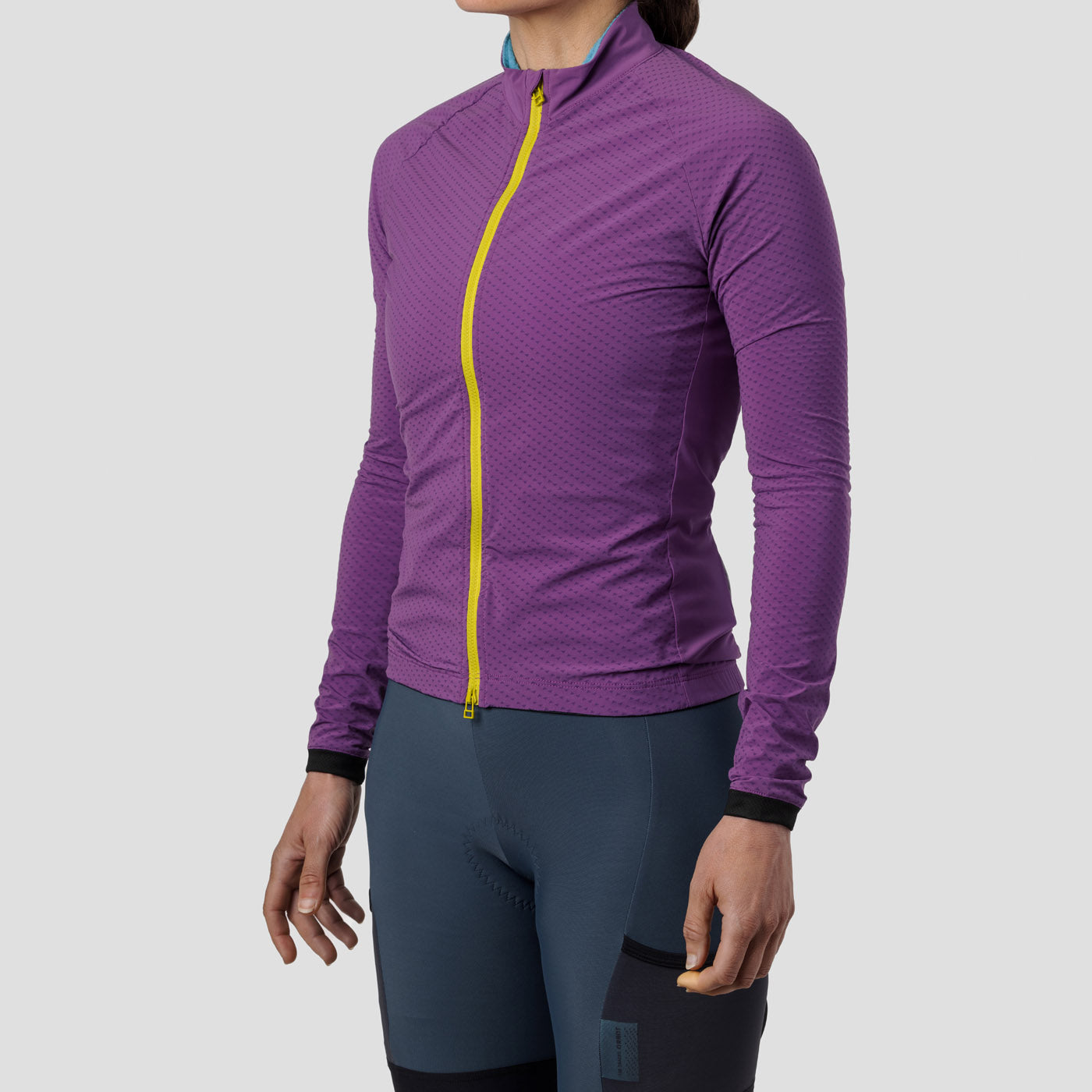 That’s not all, we designed a lofted pattern at key points to insulate, ensuring that you stay warm and dry. Speaking of dry, the fabric has a patented c0 PFAS-free DWR treatment that sheds moisture and dries fast. For its final magic trick - when not being worn, it neatly packs into its rear pocket and for stowage in a jersey pocket or strapped to your bike (see our Macgyver Strap).