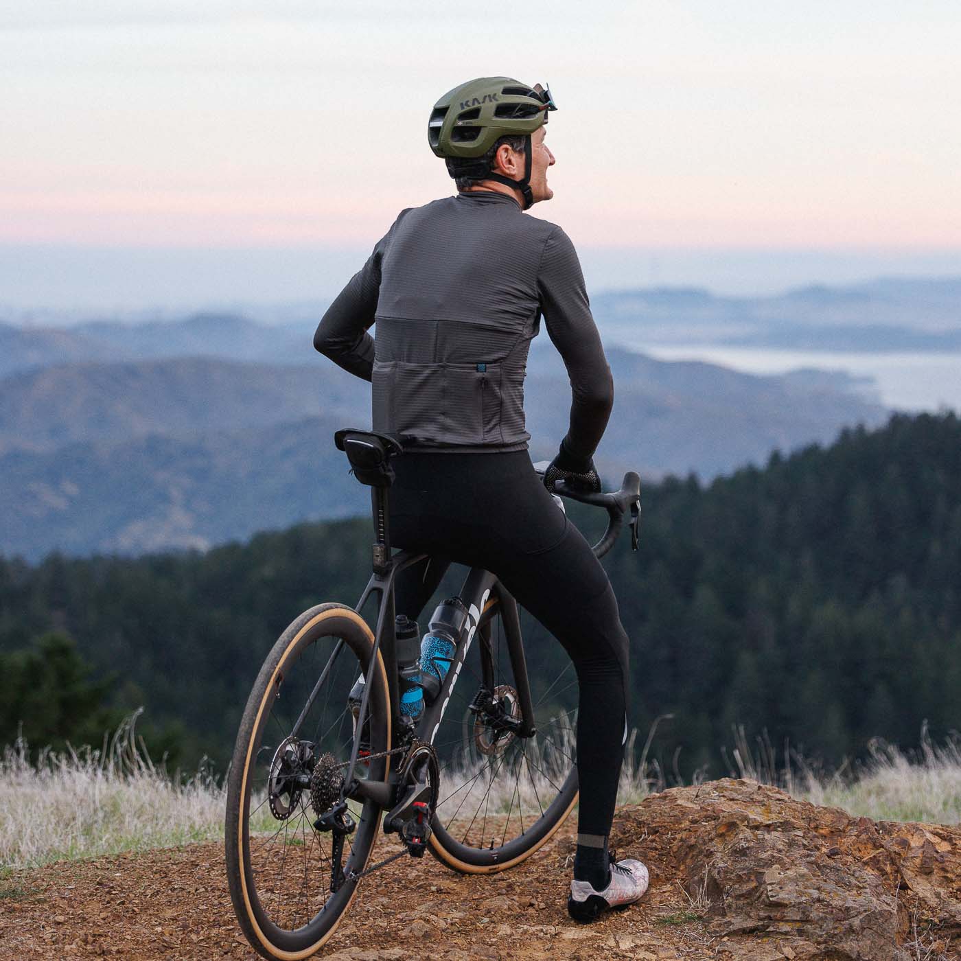 Our Grid Thermal Jersey, made from recycled content with bluesign® approved fabric, is perfect on its own or as a technical layering piece. The gridded fleece interior traps body heat between the layers while drawing moisture away from your skin, making it ideal for cool weather. We recommend wearing this jersey up to about 60 degrees on its own. When it's 55 and below we like to introduce our favorite base layer or over layer (Micro Climate, Vest, Magic Shell). This Jersey is cut and sewn in Oakland, CA.