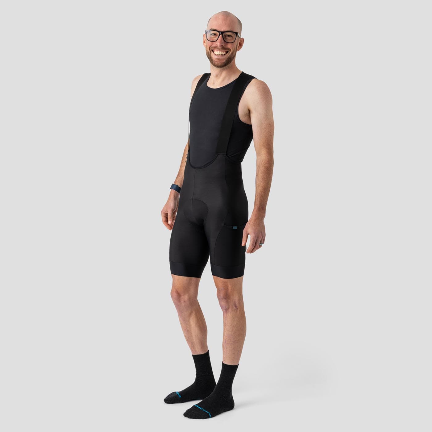Cargo Bib Shorts feature 4 pockets, 1 on each leg, 2 in the back, and reflective detailing on the backs of each leg. Our Oeko-Tex-certified endurance pad, made with recycled fibers is perfect for both long and short rides. The fabric used throughout is a recycled bluesign®-approved knit with a brushed-back cozy fleece. These are sewn in a facility powered by sustainable energy via rooftop solar panels.