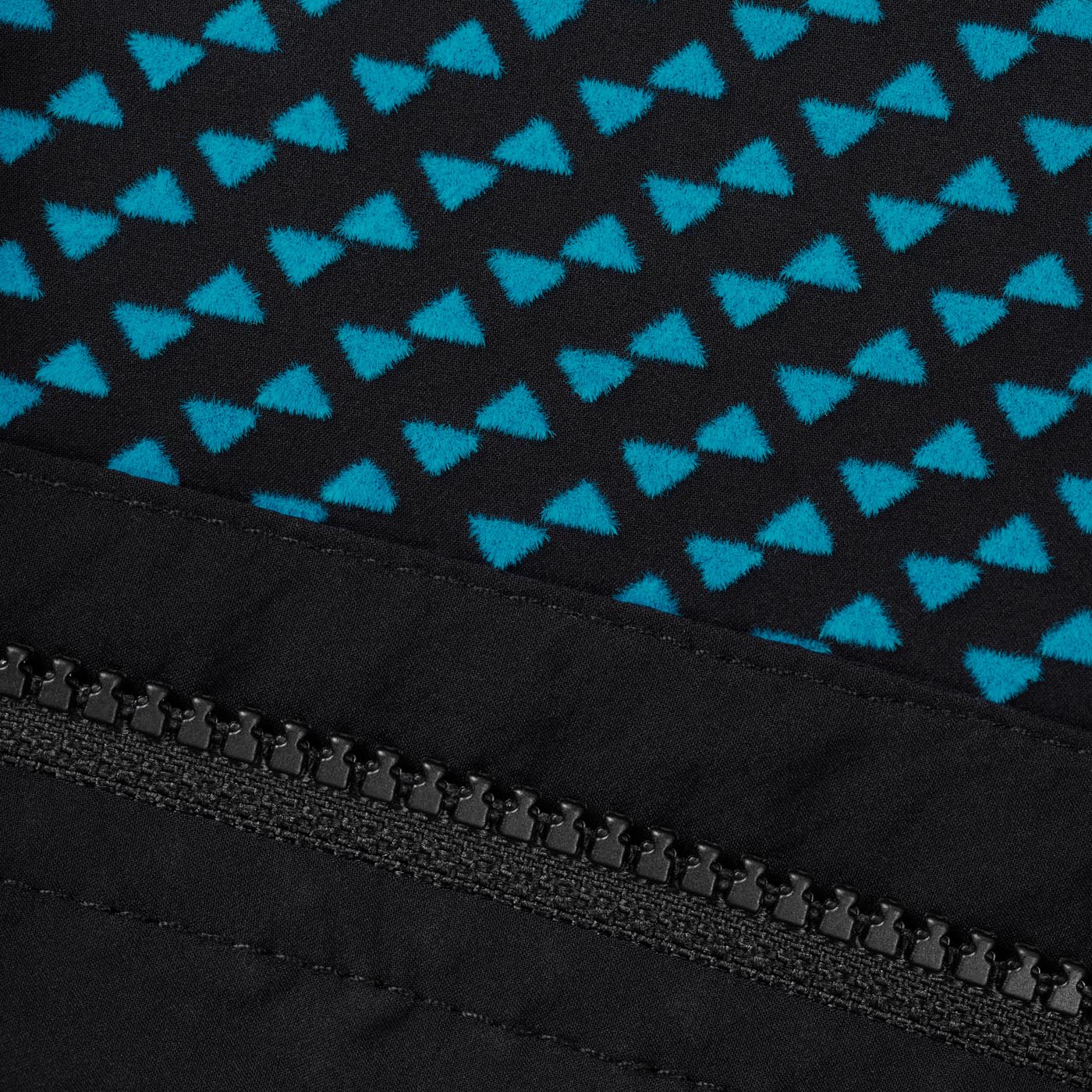 This fabric is top shelf. Specifically, it's an extremely fine stretch woven, with a whole lot of technology in the yarn and milling techniques. The lofted insulation, those little fuzzy "bowties", serve an important role in trapping heat, while the fabric does its job allowing moisture to escape, but not enter.