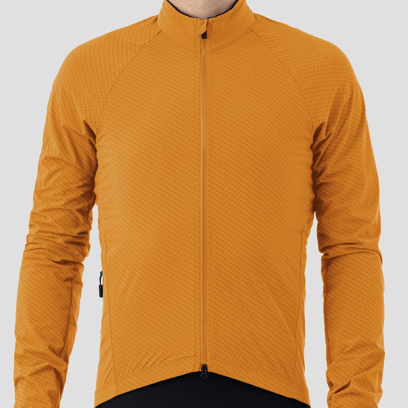 That’s not all, we designed a lofted pattern at key points to insulate, ensuring that you stay warm and dry. Speaking of dry, the fabric has a patented c0 PFAS-free DWR treatment that sheds moisture and dries fast. For its final magic trick - when not being worn, it neatly packs into its rear pocket and for stowage in a jersey pocket or strapped to your bike (see our Macgyver Strap).