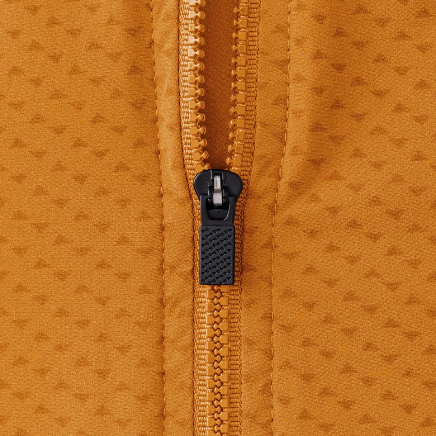 Each strand of fiber used in this fabric has a patented treatment that permanently resists moisture. This makes the jacket water-resistant and quick drying without a membrane or a coating that can wash off.