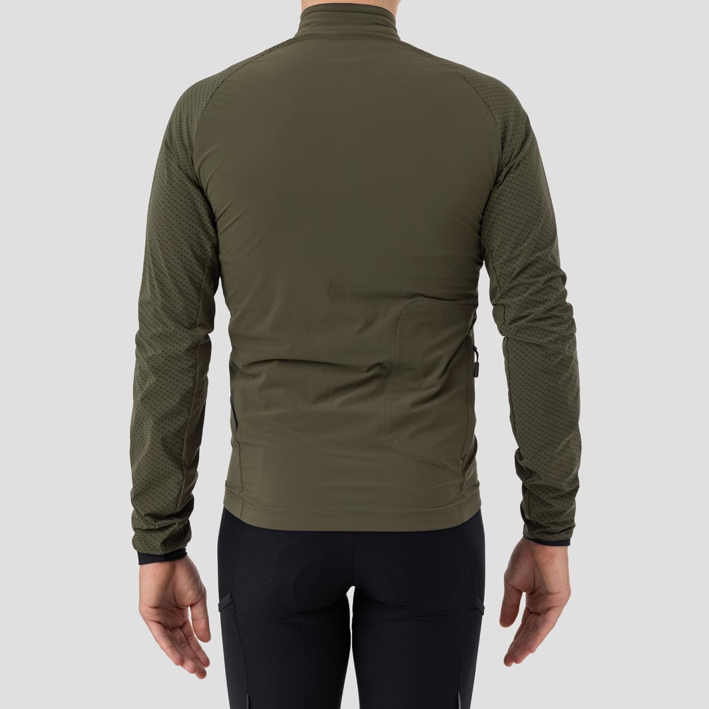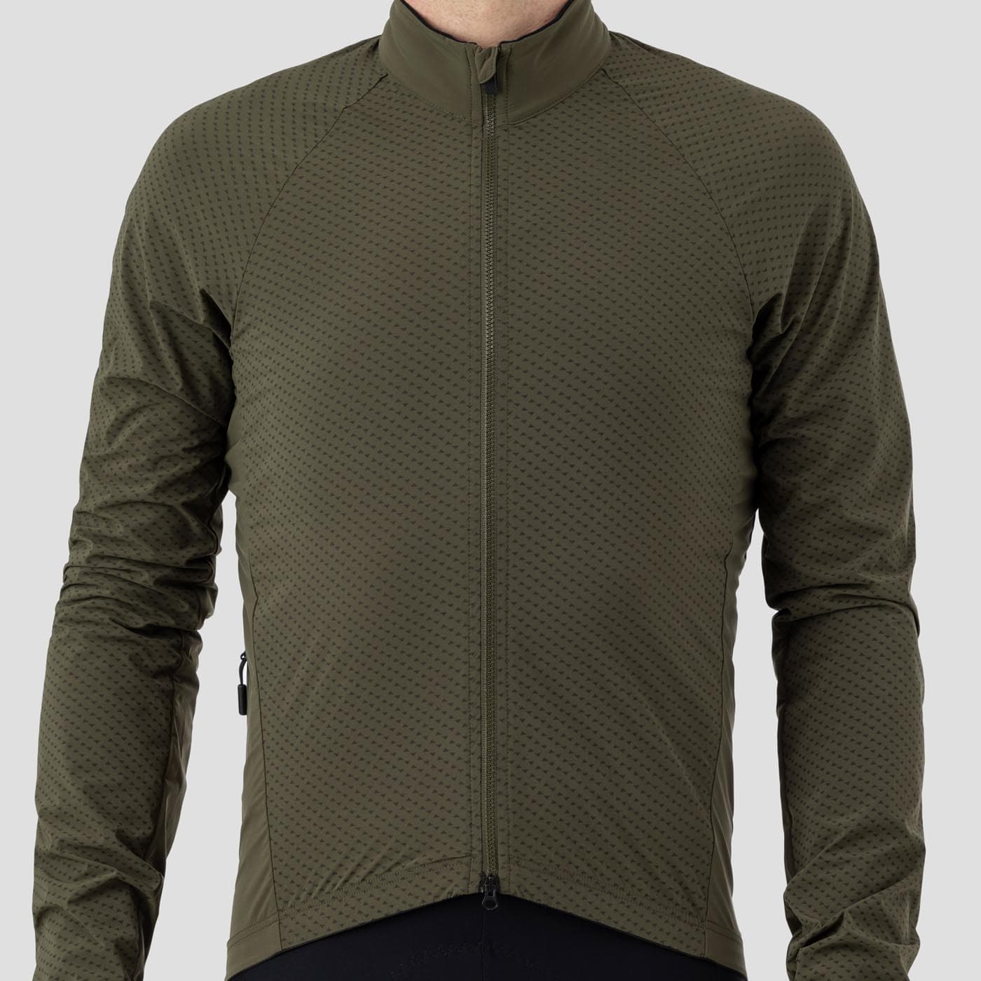 That’s not all, we designed a lofted pattern at key points to insulate, ensuring that you stay warm and dry. Speaking of dry, the fabric has a patented c0 PFAS-free DWR treatment that sheds moisture and dries fast. For its final magic trick - when not being worn, it neatly packs into its rear pocket and for stowage in a jersey pocket or strapped to your bike (see our Macgyver Strap).