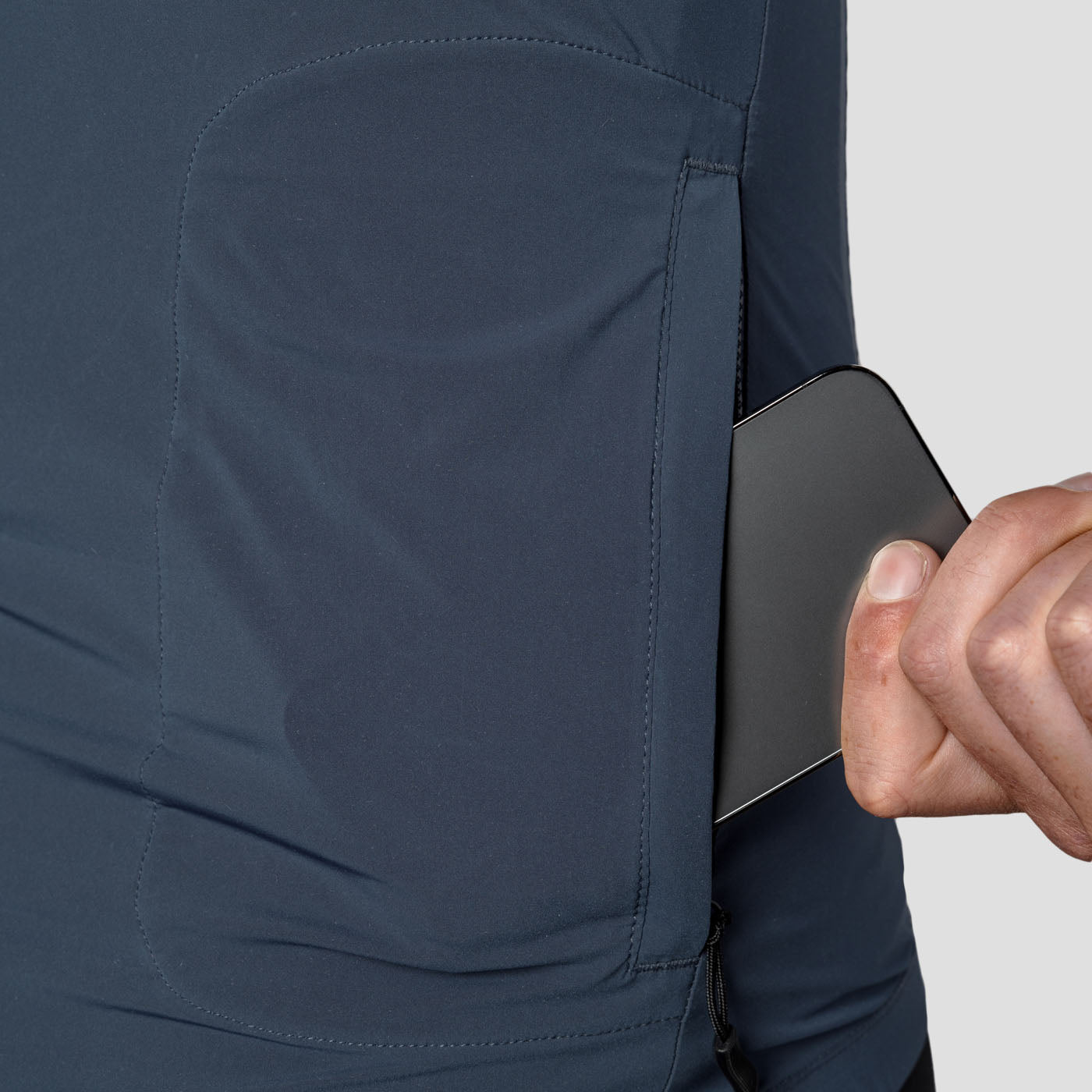 The functional rear pocket doubles as a reversible bag for the jacket. This stash bag contains the jacket, making it easier to fit in your jersey pocket, bar bag, or even strapped to your frame.