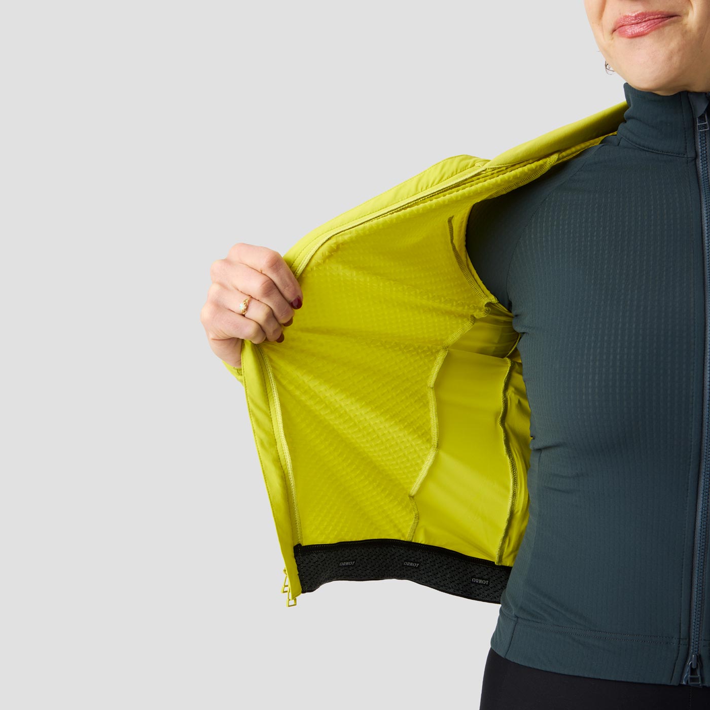 That’s not all, we designed a lofted pattern at key points to insulate, ensuring that you stay warm and dry. Speaking of dry, the fabric has a patented c0 PFAS-free DWR treatment that sheds moisture and dries fast. For its final magic trick - when not being worn, it neatly packs into its rear pocket and for stowage in a jersey pocket or strapped to your bike (see our Macgyver Strap).