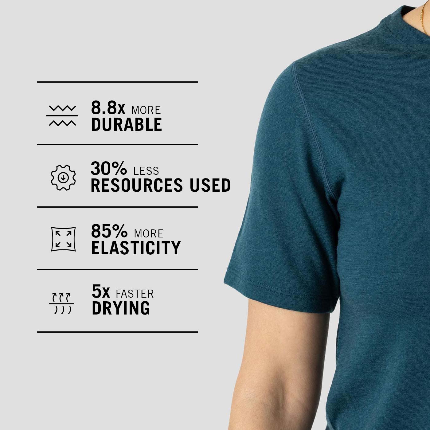• Nuyarn® dries 5x faster than traditionally spun Merino Wool.