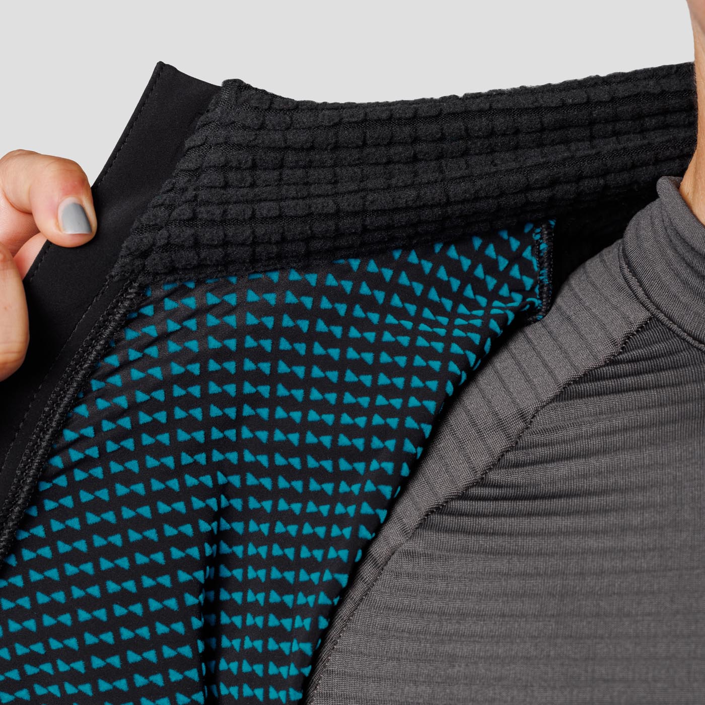 Each strand of fiber used in this fabric has a patented treatment that permanently resists moisture. This makes the jacket water-resistant and quick drying without a membrane or a coating that can wash off.