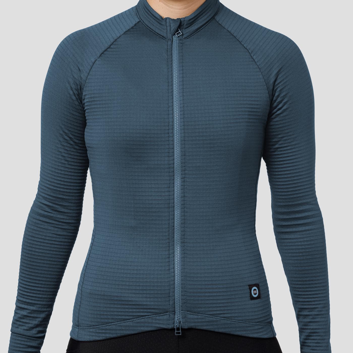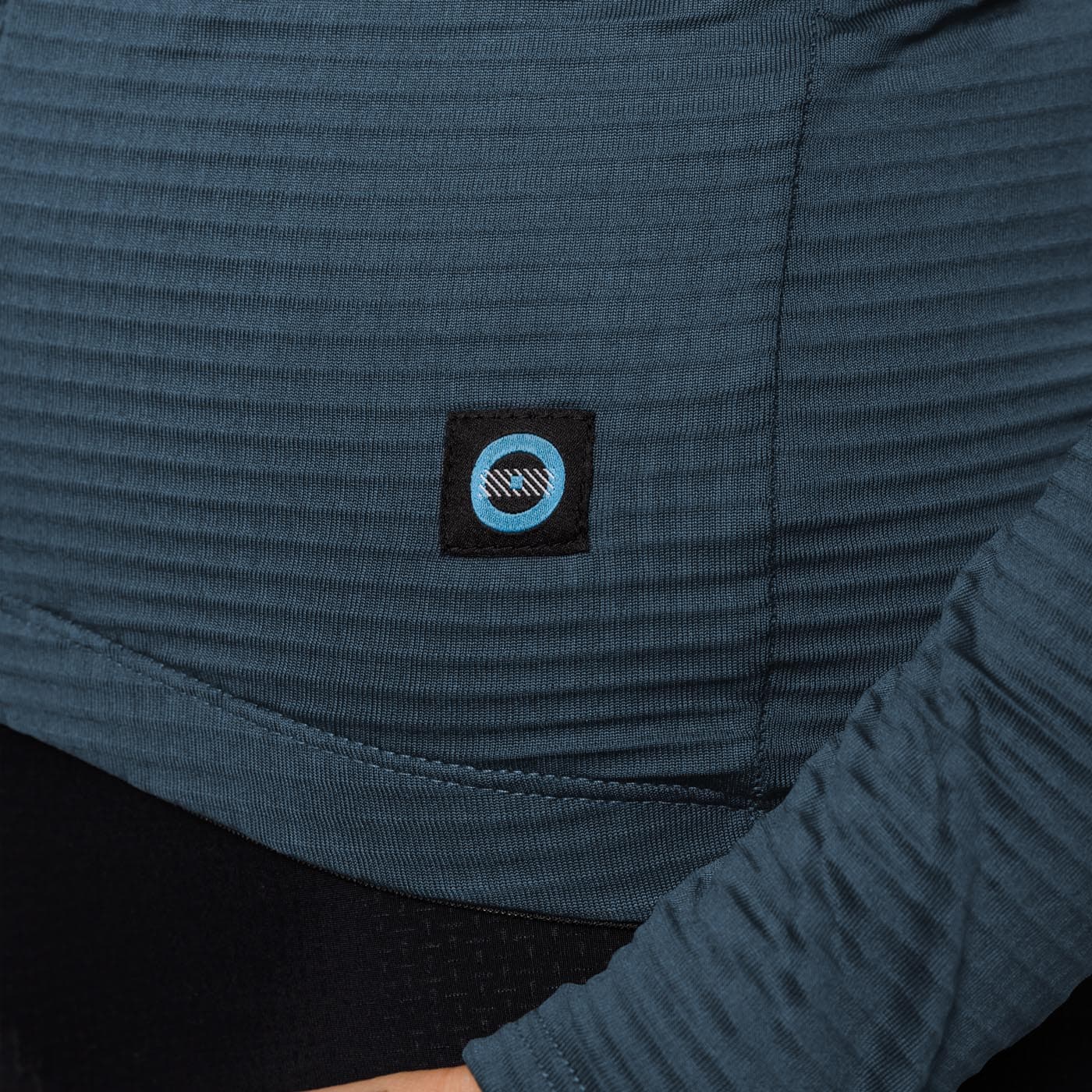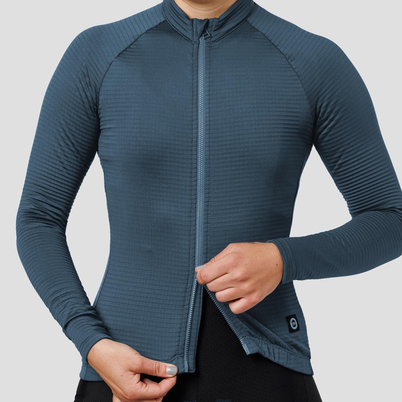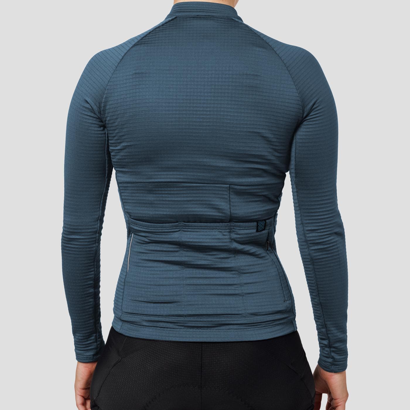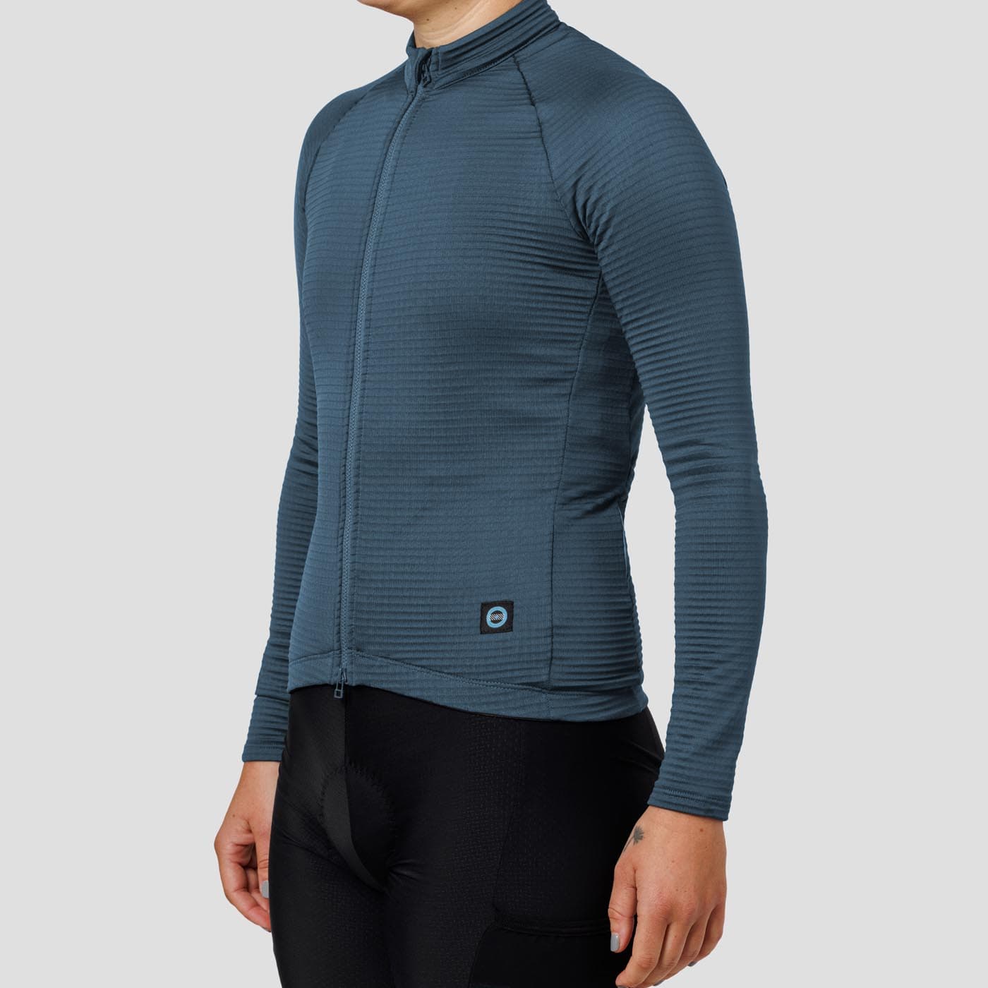 Our Grid Thermal Jersey, made from recycled content with bluesign® approved fabric, is perfect on its own or as a technical layering piece. The gridded fleece interior traps body heat between the layers while drawing moisture away from your skin, making it ideal for cool weather. We recommend wearing this jersey up to about 60 degrees on its own. When it's 55 and below we like to introduce our favorite base layer or over layer (Micro Climate, Vest, Magic Shell). This Jersey is cut and sewn in Oakland, CA.
