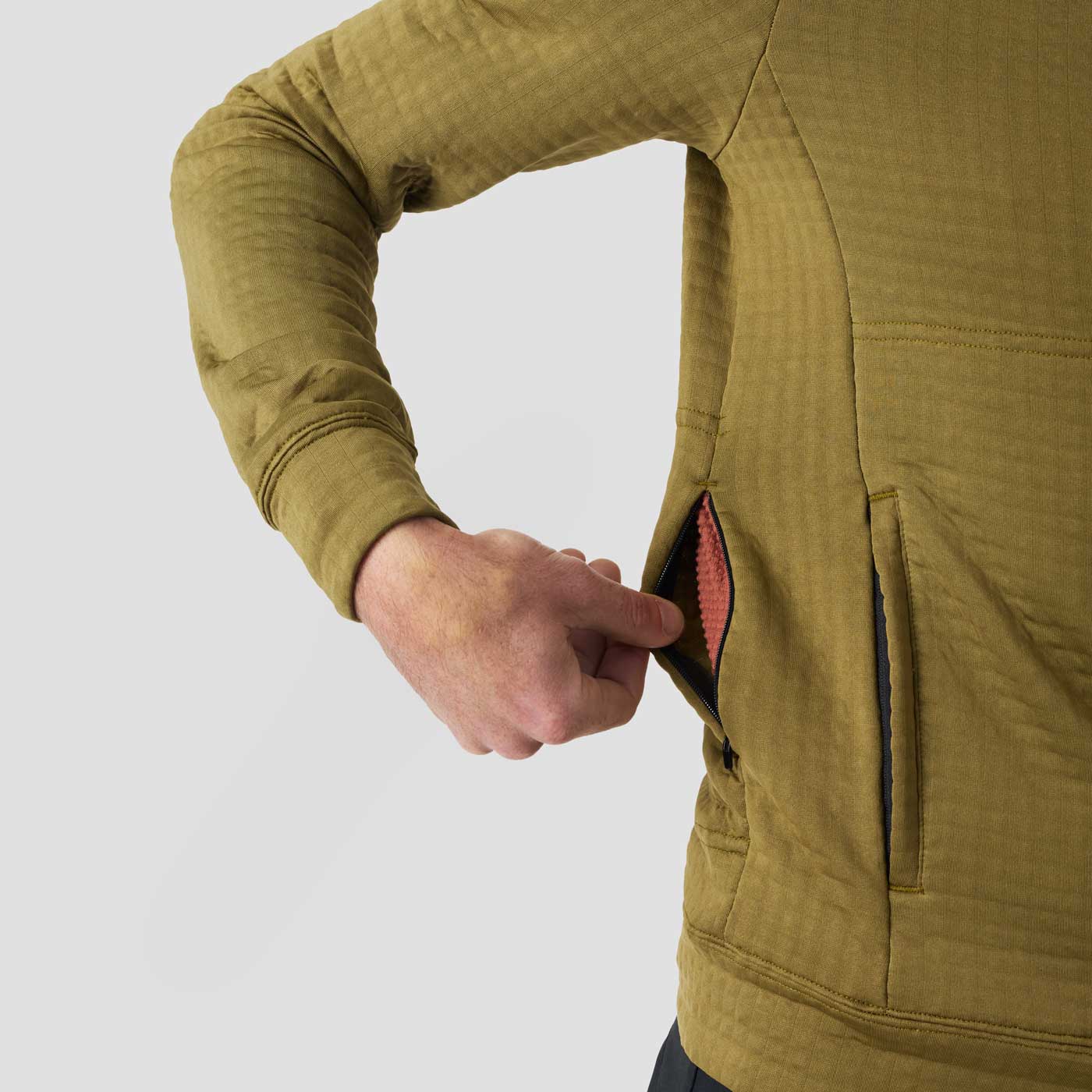 Handmade in California with Polartec® Power Air™, a next-gen fleece that traps insulating fibers in quilted pockets for warmth without bulk. The innovative knit sheds up to 5× fewer microfibers than conventional fleece and stays breathable for foggy SF mornings or wherever the day takes you. Finished with a zippered kangaroo pocket and a rear stash pocket made from deadstock Power Grid.