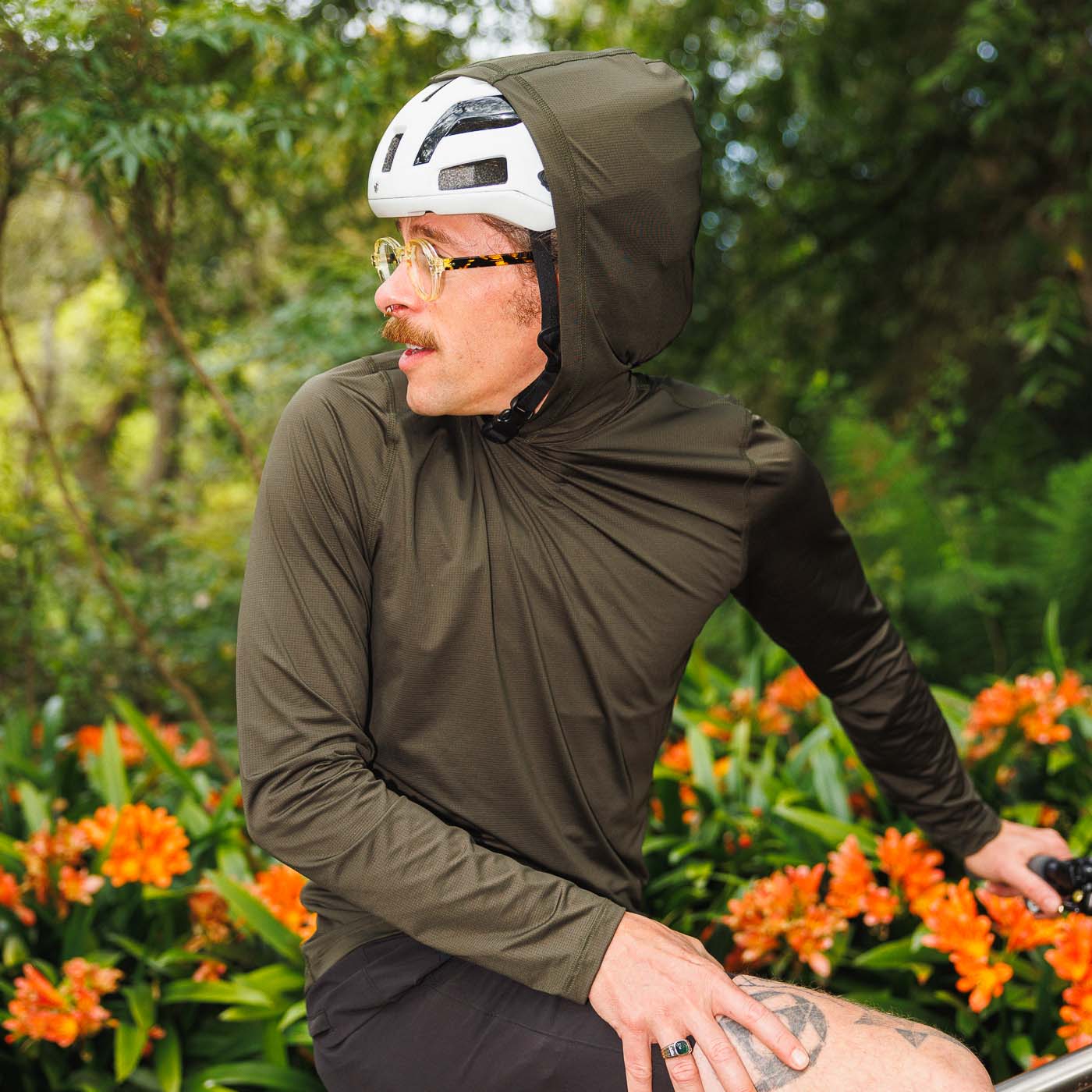 Escape the sun in our Hooded UV Trail Shirt. A go-to for gravel rides, adventures, or beach days. This lightweight, quick-drying shirt is crafted from Italian-made, Oeko-Tex approved recycled fabric, and made in the USA. It boasts UPF 30 sun protection to keep you protected and cool.
