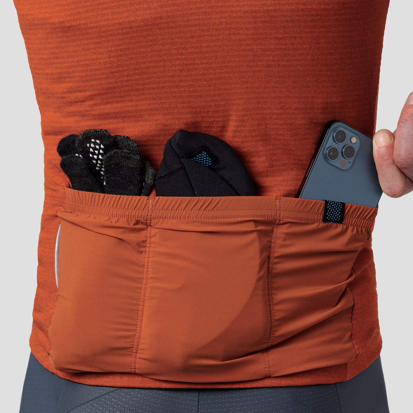 Our custom fabric is lightweight, durable, breathable, and it compresses down to easily fit in your back jersey pocket.