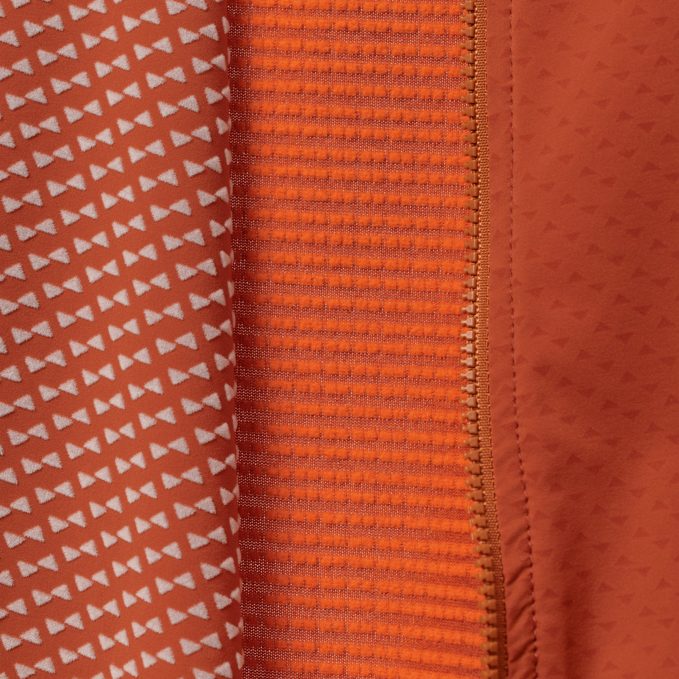 This fabric is top shelf. Specifically, it's an extremely fine stretch woven, with a whole lot of technology in the yarn and milling techniques. The lofted insulation, those little fuzzy "bowties", serve an important role in trapping heat, while the fabric does its job allowing moisture to escape, but not enter.