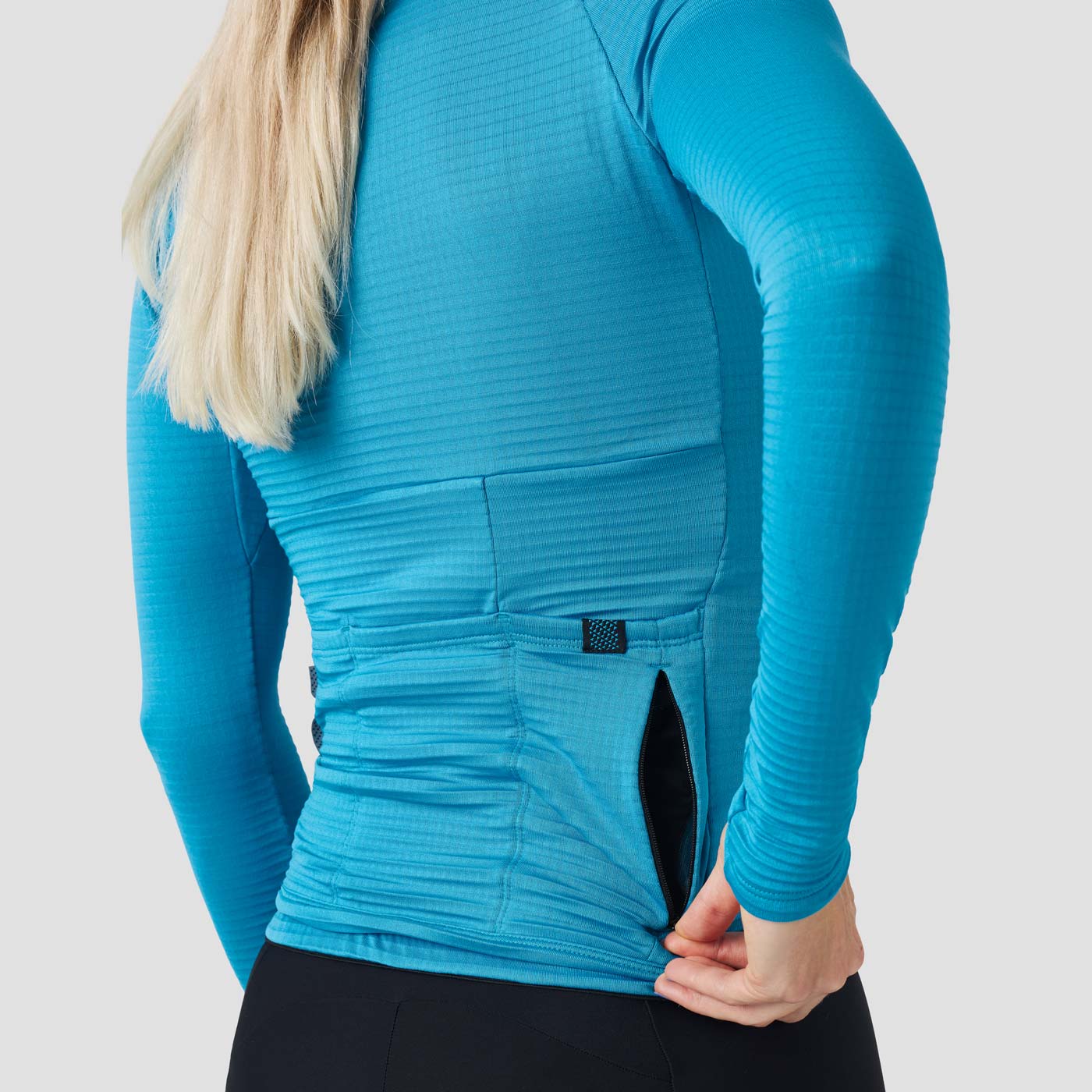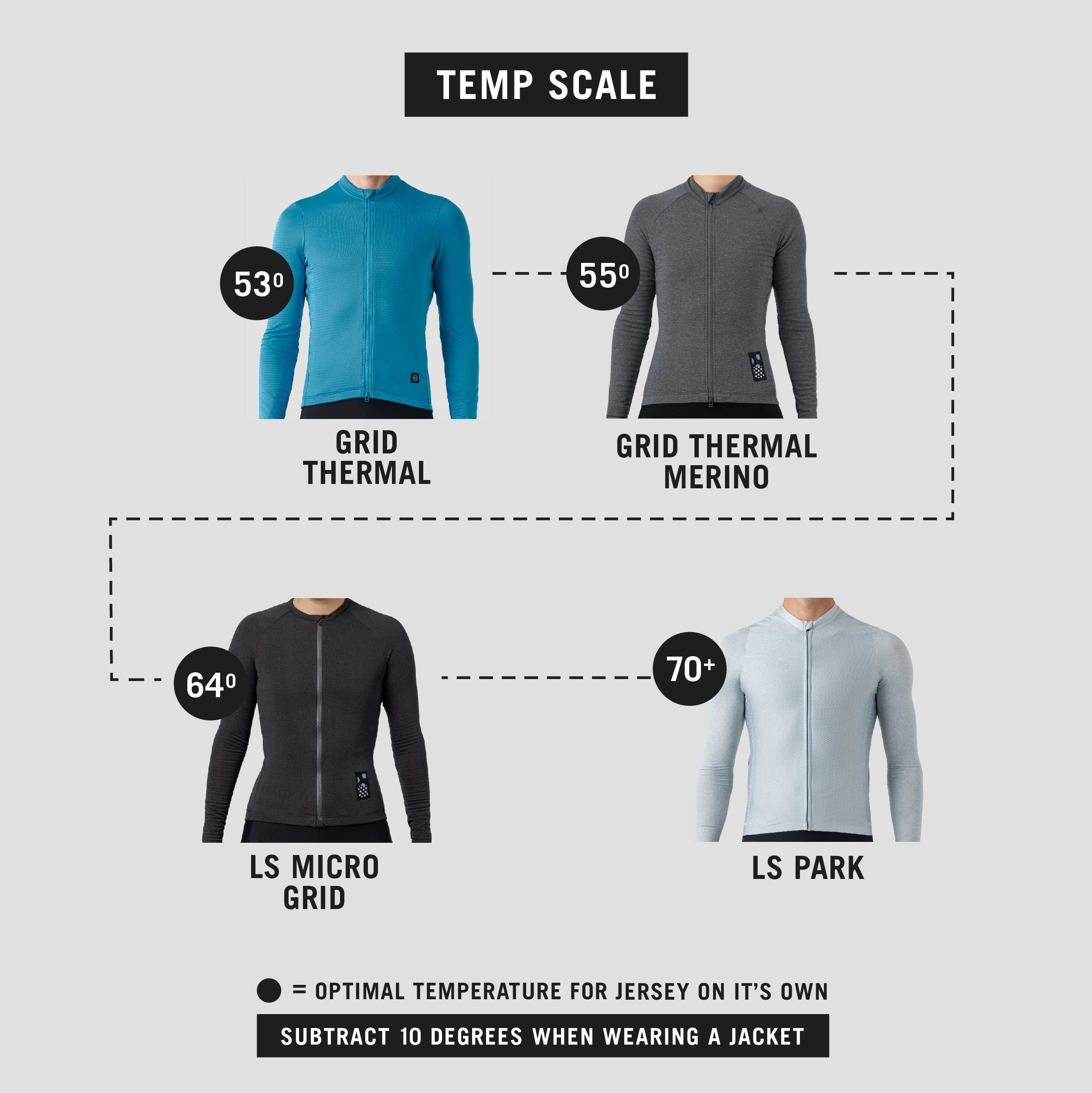 Our Grid Thermal Jersey, made from recycled content with bluesign® approved fabric, is perfect on its own or as a technical layering piece. The gridded fleece interior traps body heat between the layers while drawing moisture away from your skin, making it ideal for cool weather. We recommend wearing this jersey up to about 60 degrees on its own. When it's 55 and below we like to introduce our favorite base layer or over layer (Micro Climate, Vest, Magic Shell). This Jersey is cut and sewn in Oakland, CA.