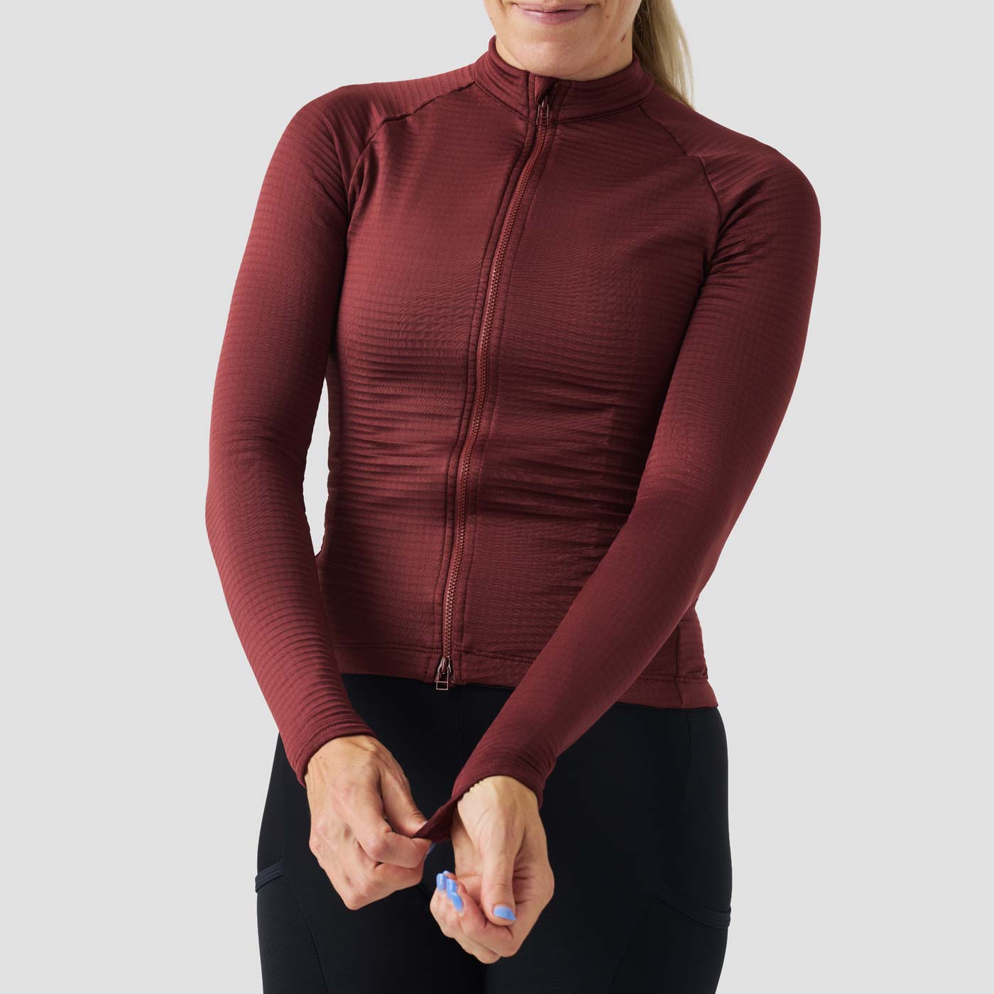 Our Grid Thermal Jersey, made from recycled content with bluesign® approved fabric, is perfect on its own or as a technical layering piece. The gridded fleece interior traps body heat between the layers while drawing moisture away from your skin, making it ideal for cool weather. We recommend wearing this jersey up to about 60 degrees on its own. When it's 55 and below we like to introduce our favorite base layer or over layer (Micro Climate, Vest, Magic Shell). This Jersey is cut and sewn in Oakland, CA.